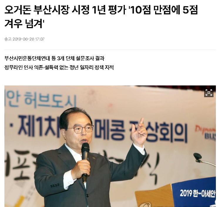 오거돈 시장 민선7기 1년에 대한 평가에서 10점 만점(척도 평균 5.5점)에서 전문가와 단체회원으로부터 가장 높은 점수를 받은 분야는 시민 참여 확대(전문가 5.49점/단체회원 5.38점), 임기동안 부산발전 성과 기대(전문가 5.37점/단체회원 5.29점)으로 나타난 반면 가장 낮은 점수를 받은 분야는 일자리 확대(전문가 4.13점/단체회원 4.11점), 산업 및 경제 발전(전문가 4.43점/단체회원 4.42점)으로 나타났다.